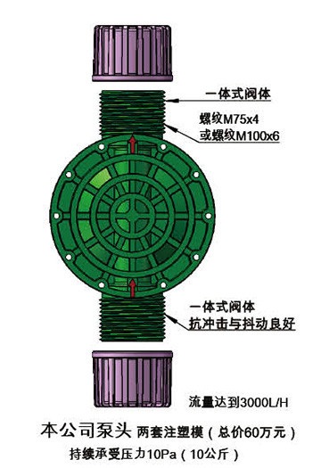 ![]() | 本公司的計量泵使用的是一體式泵頭。生產(chǎn)工藝是開制塑料模具,然后使用模具生產(chǎn)泵頭。整個泵頭是一體式結(jié)構(gòu)。外至螺紋為考慮強度,螺紋可無限放大,泵頭注塑??刹捎锰土戏绞剑黾拥某杀静⒉粫?。這樣,泵頭所承受的壓力可以達(dá)到很高。而且泵頭非常結(jié)實,強度是普通泵頭的兩倍以上。不會發(fā)生斷裂滲漏的情況,大大增加了計量泵的使用壽命。 |
