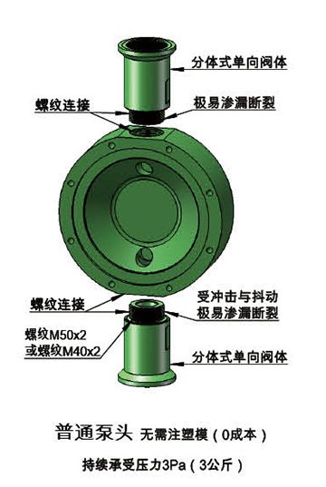 | 現(xiàn)在市場上的計量泵大多使用的是普通泵頭。就是采用PVC圓棒用車床加工的方式生產(chǎn)。兩端放球閥的地方只能采取內(nèi)外螺紋連接方式。螺紋越大,圓棒的厚度就會越大,增加的成本會翻倍。300毫米以上PVC圓棒國產(chǎn)幾乎生產(chǎn)不出來。德國進(jìn)口價格比國產(chǎn)高兩倍還多。圓棒厚度越薄,成本越低,但強度也越差。結(jié)果是泵頭所承受的壓力不高,計量泵是脈沖式運行,沖擊力與抖動力很大,所以,泵頭連接部位容易斷裂滲漏,大大減少了計量泵的使用壽命。 | ![]() |