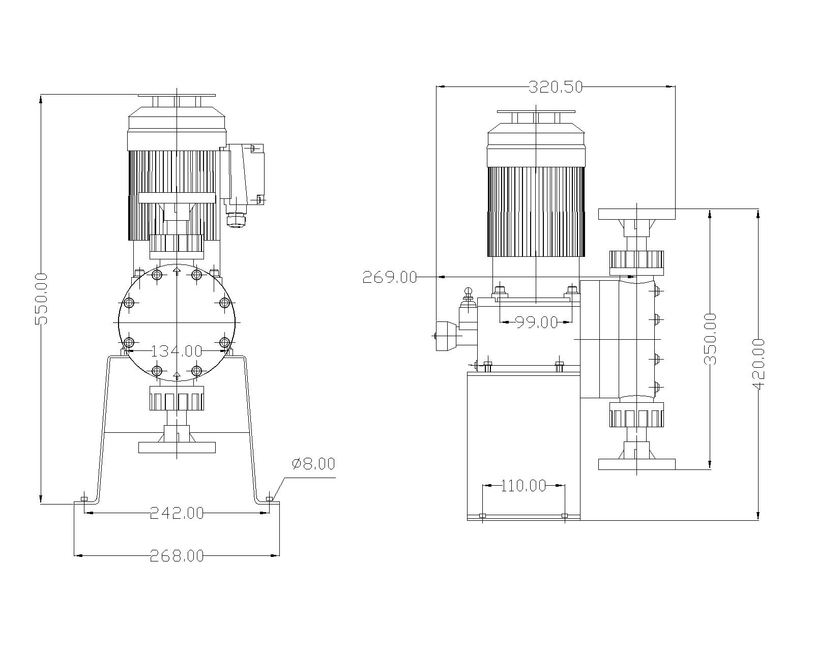(kg/cm2) | l/h | l/min | Stroke/min | mm | kw | kg | 法蘭DN | 軟管 | ||